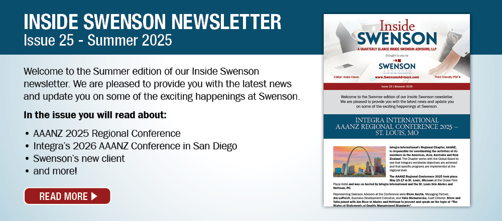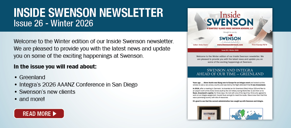 Swenson Advisors, LLP (Swenson) is a full service accounting, tax, consulting, and Lease Accounting firm. Since 1998, the Firm has provided comprehensive services to middle-market public and private companies, as well as high net worth individuals throughout Southern California. The Firm services a variety of industries including technology, real estate, manufacturing, distributing, biotechnology, cleantech, and non-profits.
