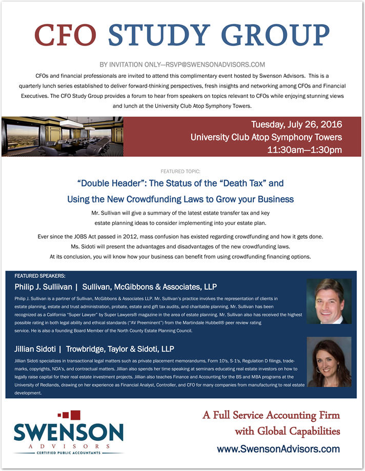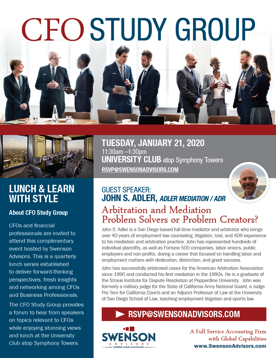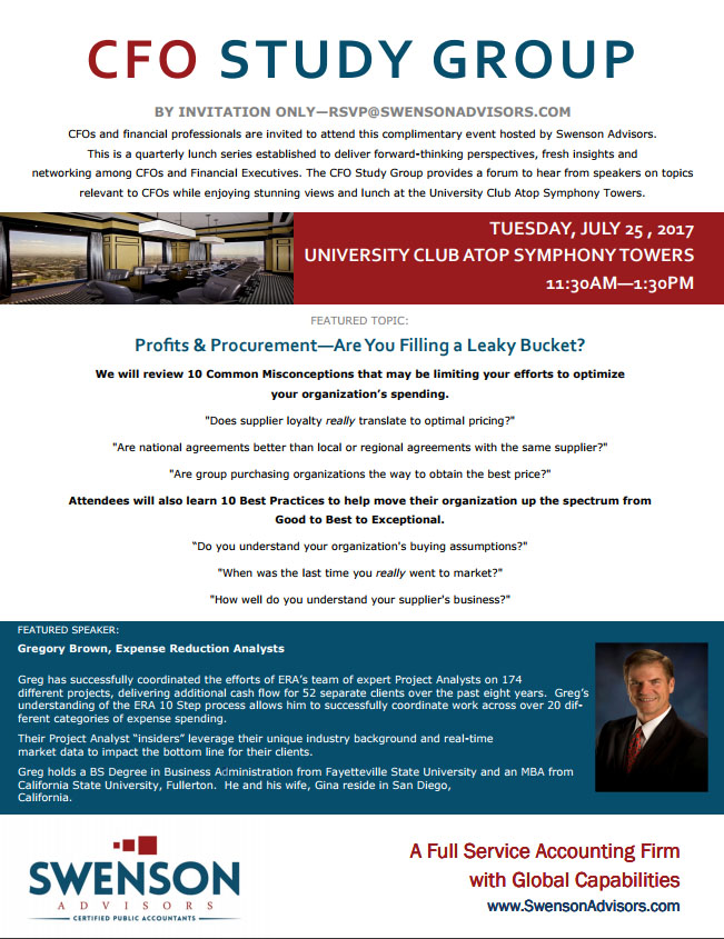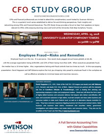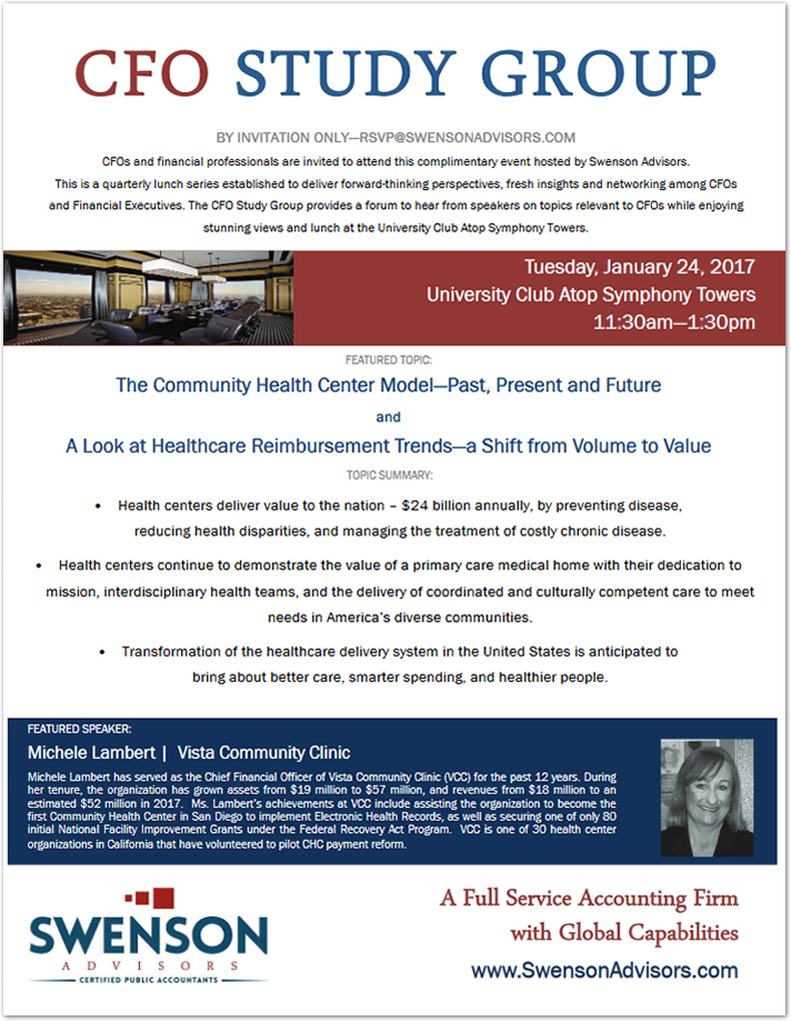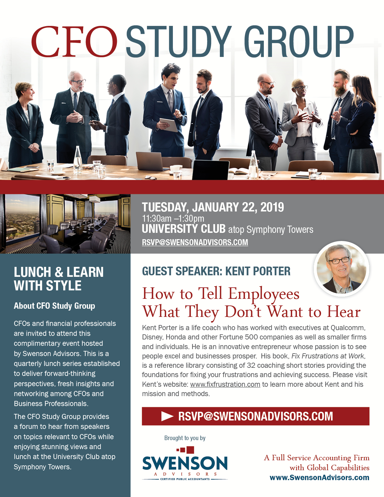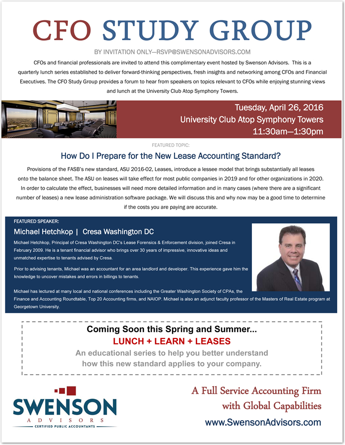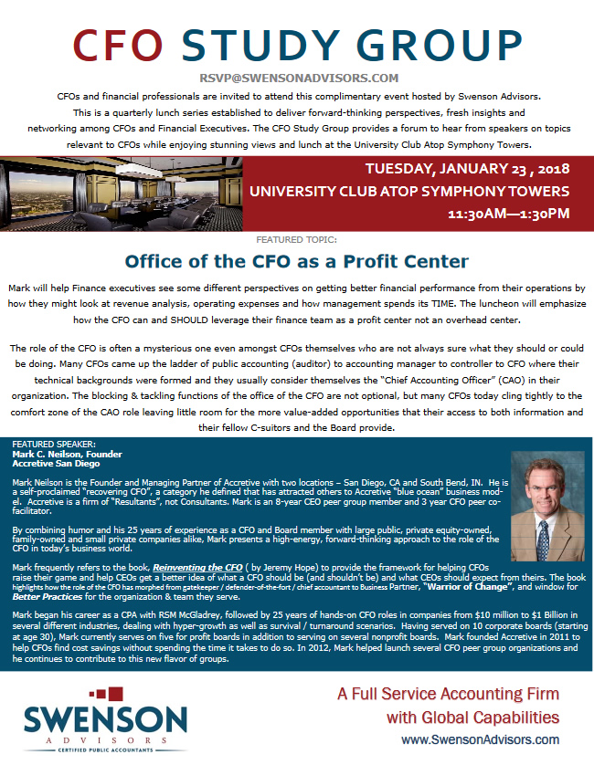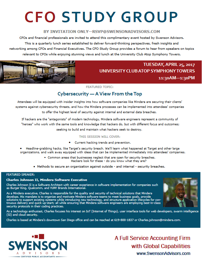 This is a quarterly lunch series established to deliver forward-thinking perspectives, fresh insights and networking among CFOs and Financial Executives. Sponsored by Swenson Advisors, this series provides an opportunity hear from speakers on topics relevant to CFOs over stunning views and lunch at the University Club Atop Symphony Towers.