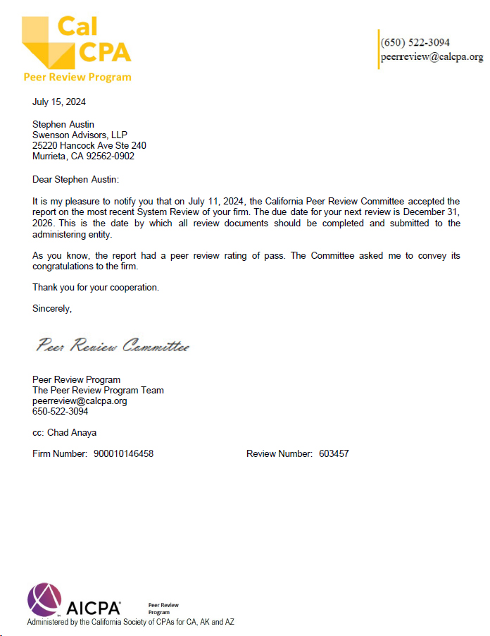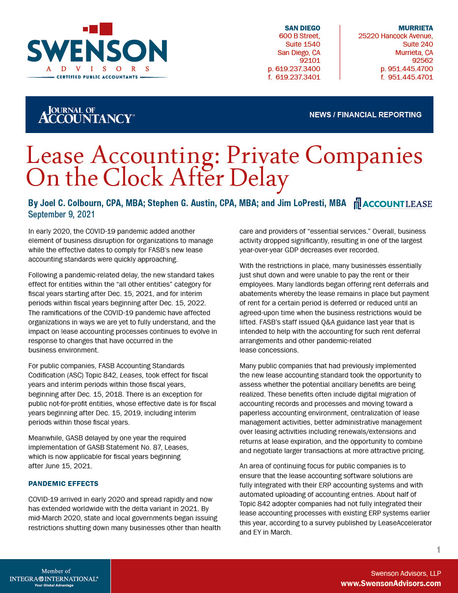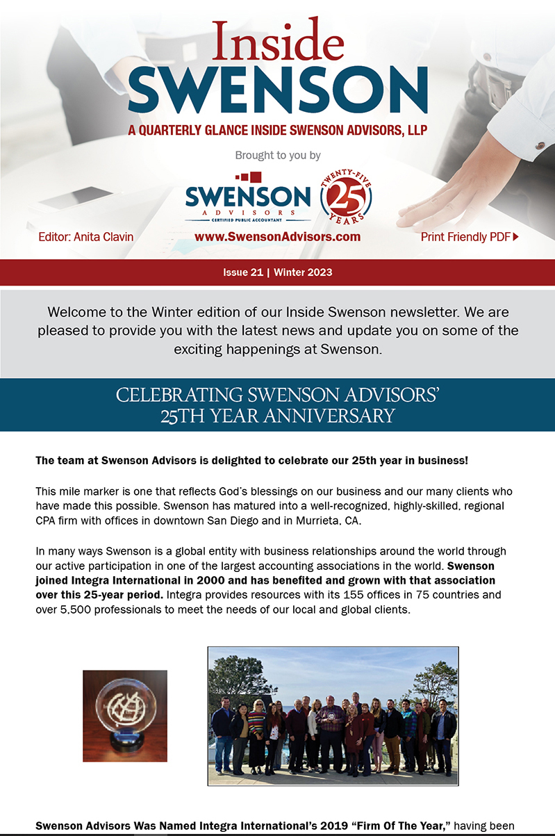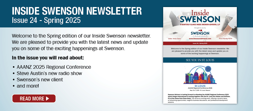 Swenson Advisors, LLP (Swenson) is a full service accounting, tax, consulting, and Lease Accounting firm. Since 1998, the Firm has provided comprehensive services to middle-market public and private companies, as well as high net worth individuals throughout Southern California. The Firm services a variety of industries including technology, real estate, manufacturing, distributing, biotechnology, cleantech, and non-profits.